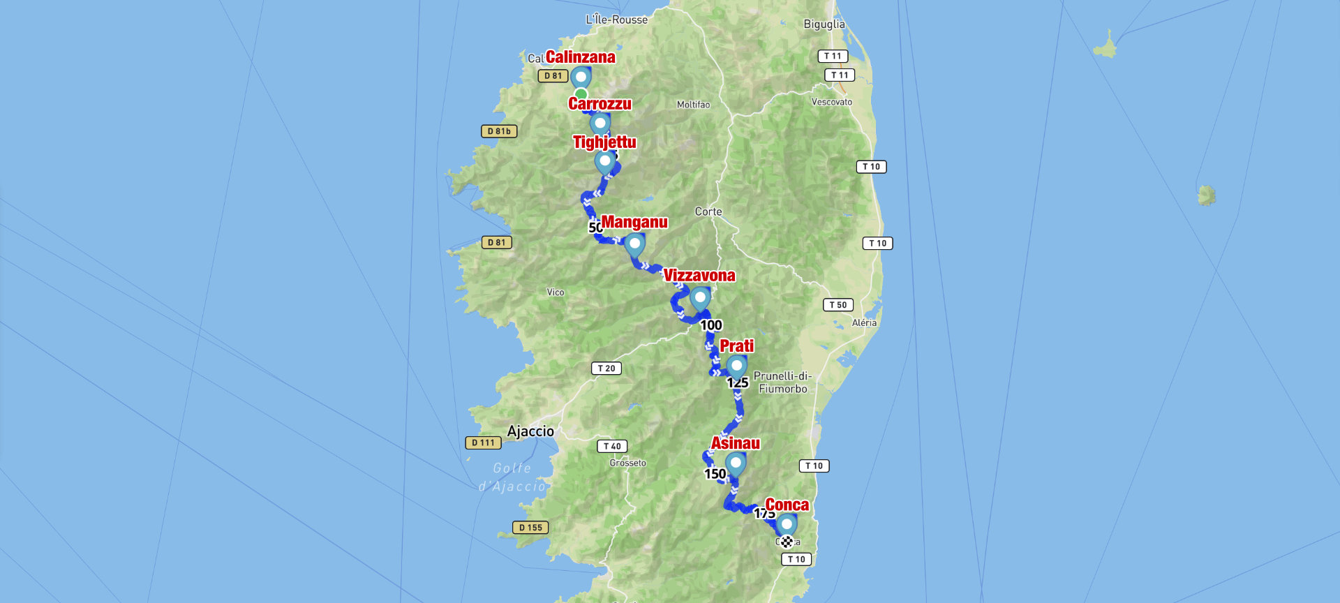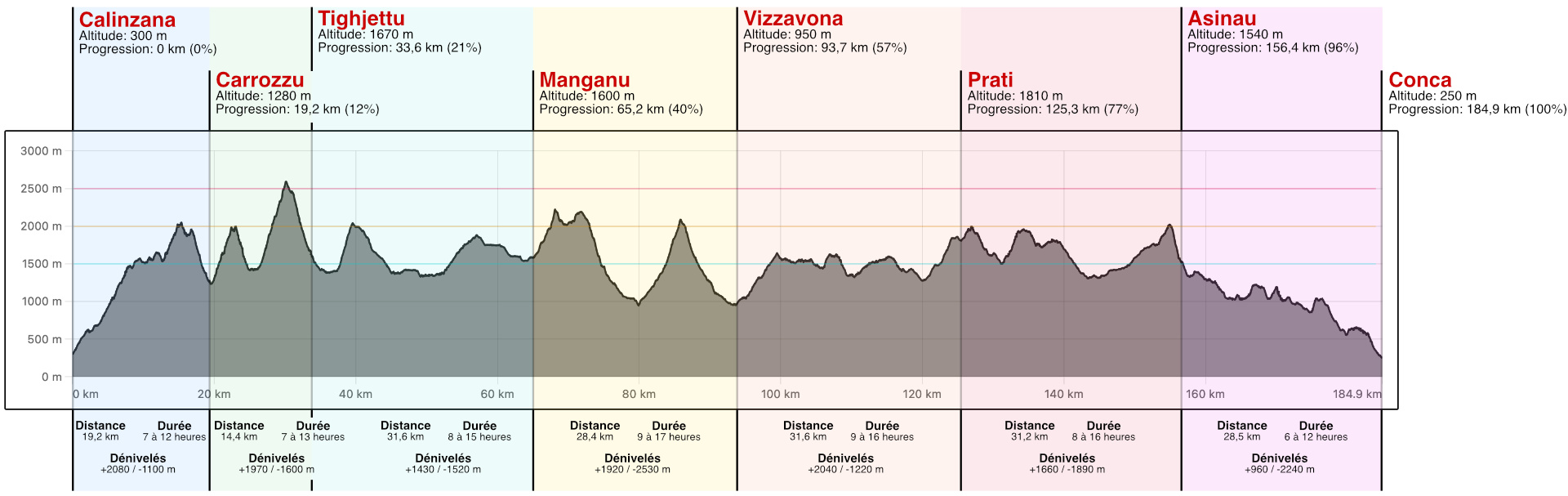 Visualise ton itinéraire d’un seul coup d’œil grâce à cette carte du GR®20 en 7 jours. Pour cet itinéraire en particulier, tu traverseras successivement 7 étapes : Calinzana, Carozzu, Tighjettu, Manganu, Vizzavona, Prati, Asinau, avant de terminer à Conca. Cette vue d’ensemble t’aide à mieux te repérer dans l’espace.